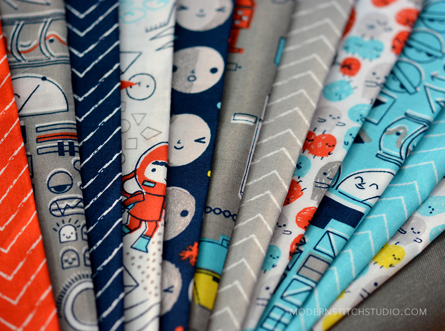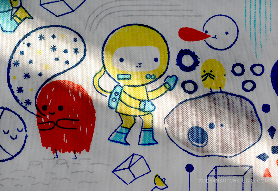 I love all the fabrics in this collection but I think this one is my favorite. Check out this awesome astronaut gal. I imagine she is showing off her sweet dance moves (with those great turquoise boots) to her new friends. Ha!